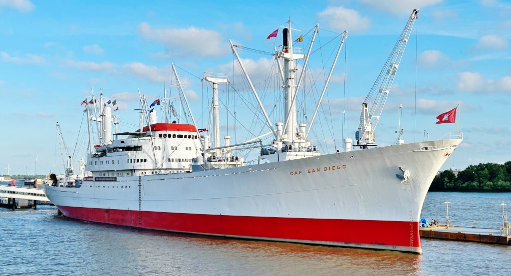 De CAP SAN DIEGO (BRT 9998 en 159 bij 22 meter), een conventioneel stukgoedschip met vijf ruimen en veel bewerkelijk laadgerei, kwam begin 1962 in de vaart en liep 20 jaar lang regelmatig Rotterdam aan. In 1981 werd omgevlagd van Duitsland naar Spanje en kreeg het schip de kleurrijke naam SANGRIA. De andere vijf werden gesloopt, maar de CAP SAN DIEGO bleef behouden als maritiem erfgoed. In 1986 werd ze verworven door de Vrije Hanzestad Hamburg en keerde terug naar de oorspronkelijke thuishaven. Sinds 1988 is het als museumschip onder beheer van de Stiftung Hamburger Admiralität. In de lijndienstjaren bestond de bemanning uit 38 koppen en was er accommodatie voor 12 passagiers. Een MAN Augsburg 2-takt 9-cilinder dieselmotor van 8691 kW genereerde een dienstvaart van 19 knopen. De machinekamer is nog steeds in takt en incidenteel wordt er nog mee gevaren. Om te overnachten kan een hut geboekt worden.